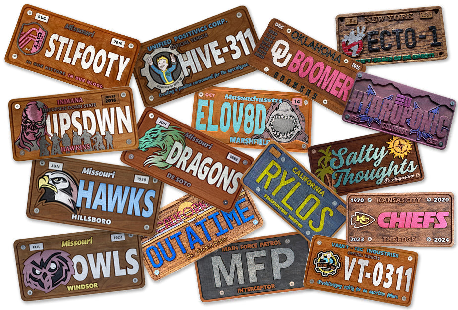 License plates are our specialty - and we love making them! From your favorite bands and blockbusters to cult TV classics and fan-favorite characters, we've got designs that speak your language. Each plate is precision carved from solid hardwood, hand sanded, and stained, and hand painted with Extreme Sheen metallic paints from DecoArt for that gorgeous, durable shine. New designs drop regularly, and most can be personalized online to make them totally yours. Handcrafted in the USA.