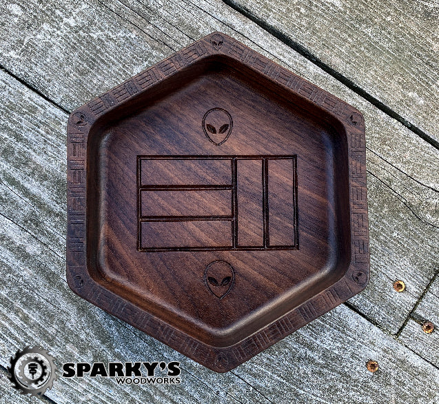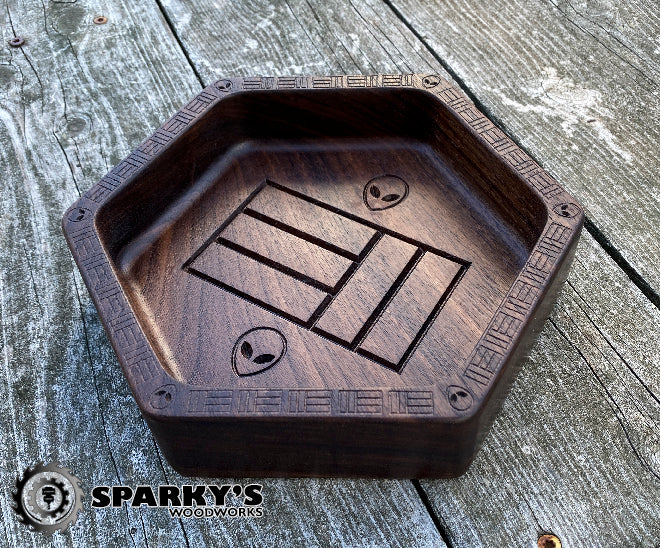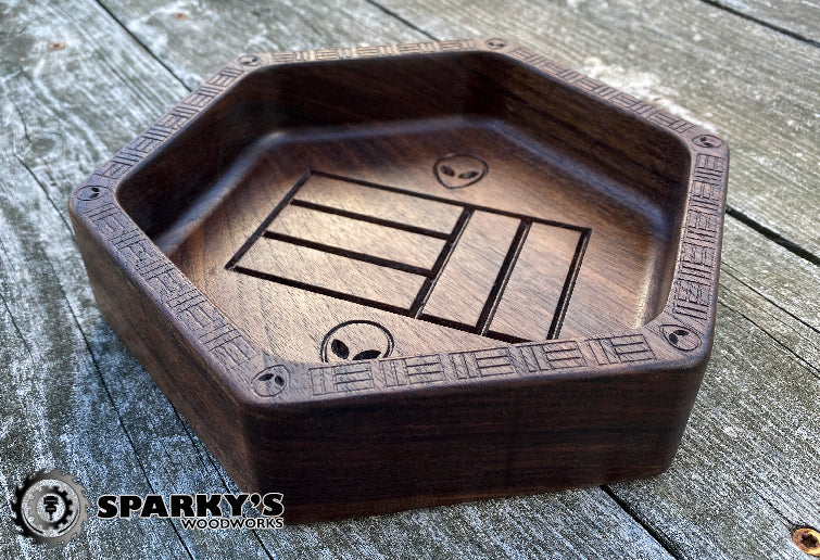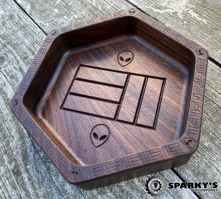 Perfect for the Excitable with five of everything, this catch-all tray/bowl is crafted from a solid Premium Black Walnut, hand-sanded, and treated with tung oil to bring out the amazing color and grain of this beautiful wood.