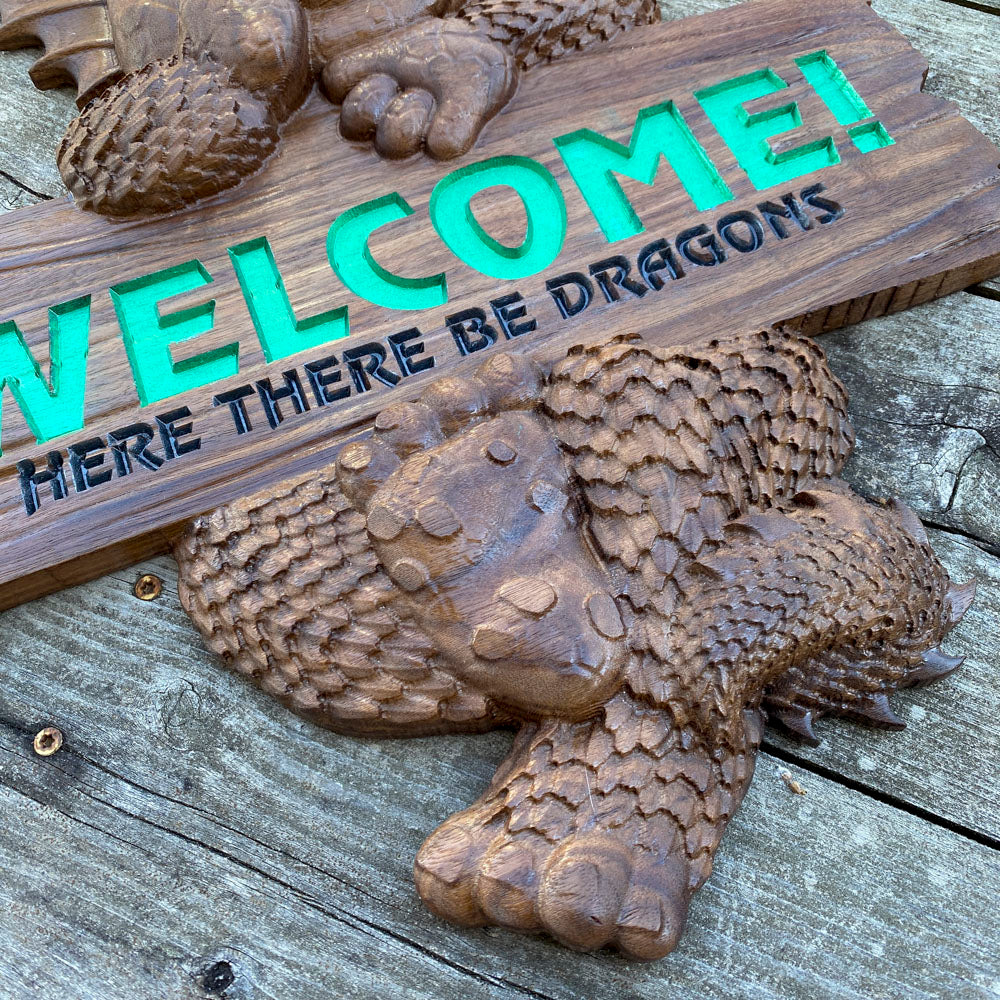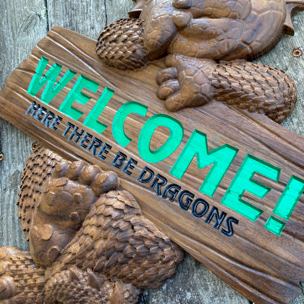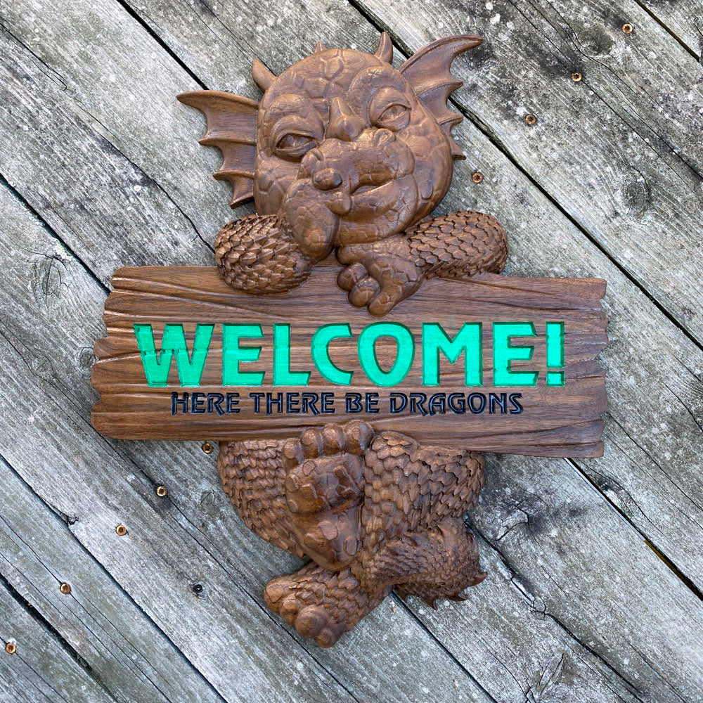 Here there be DRAGONS! This precision carved welcome sign is perfect for any dragon lover's home! Carved from 2" thick solid Premium Walnut, this is a one-of-a-kind exquisite hand-crafted welcome sign. Hand treated with tung oil to bring out the rich color and detail of the wood, and hand painted with extreme sheen metallic paints, this sign is a stunner and is sure to grab your guest's attention, and the super-cute baby dragon is sure to make them smile!