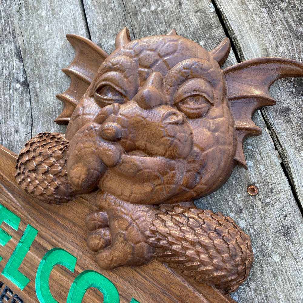 3D Carved Baby Dragon Welcome Sign - Solid Premium Walnut - Made in USA