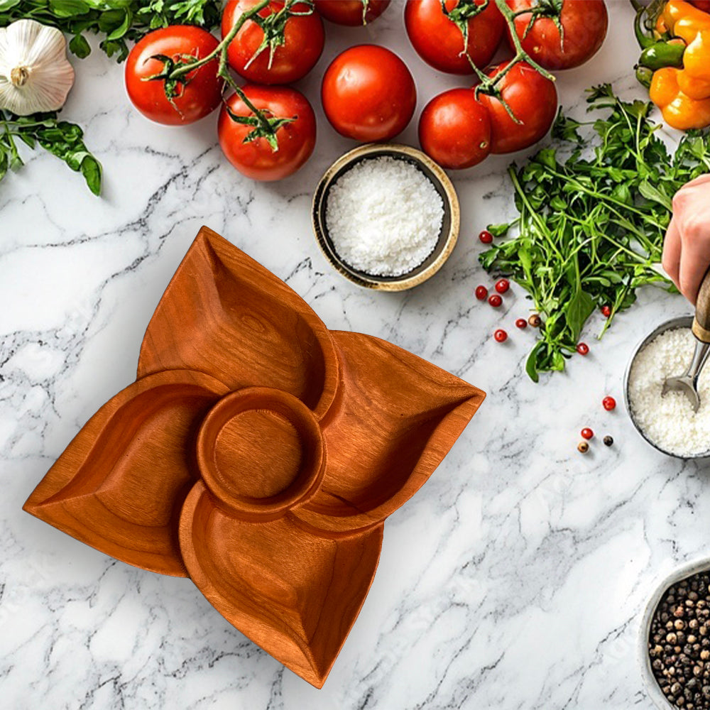 Delight in the beauty of this small 3D flower tray, precision carved from 2" thick solid cherry wood. Each tray is uniquely crafted, showcasing natural wood variations and exquisite detail. Hand sanded and finished, then treated with food-grade cutting board oil, it offers a smooth, safe surface perfect for serving or display. Made with care in the USA, this tray combines artistry and functionality in a charming, timeless piece.