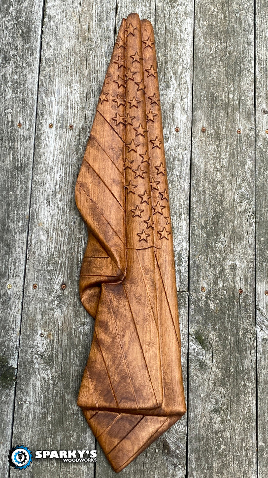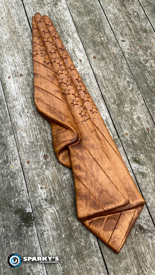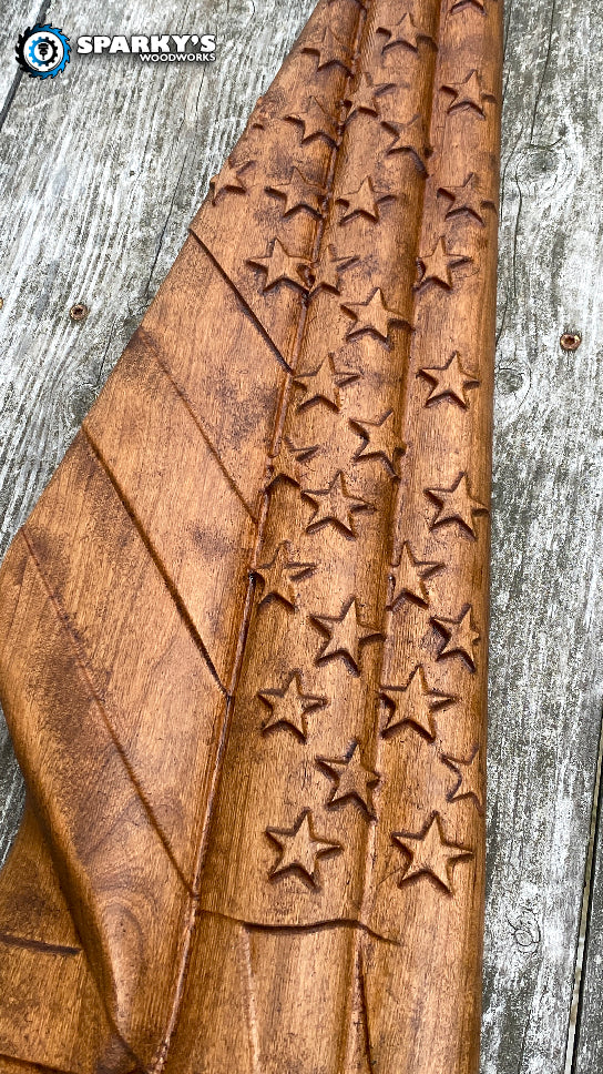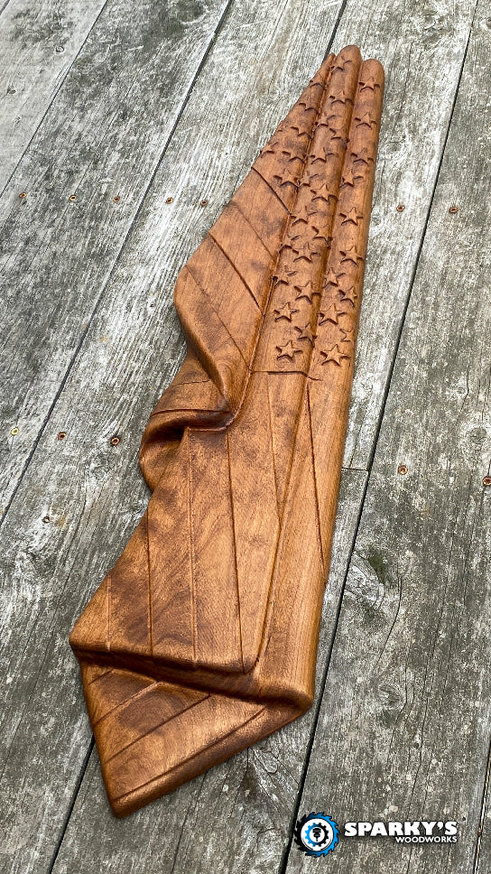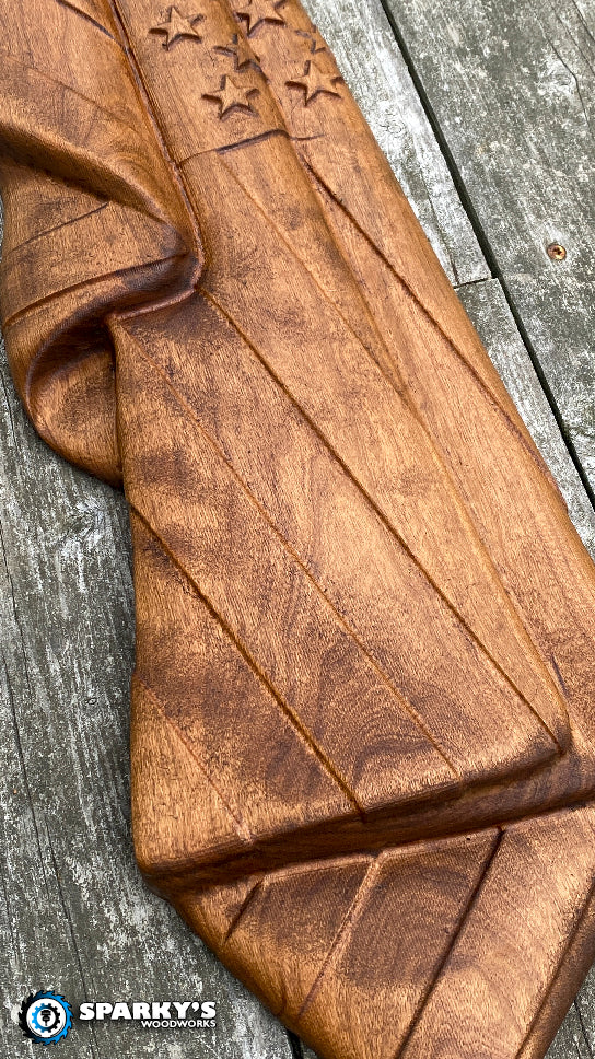 3D hanging American Flag crafted from 2" thick solid Cherry.