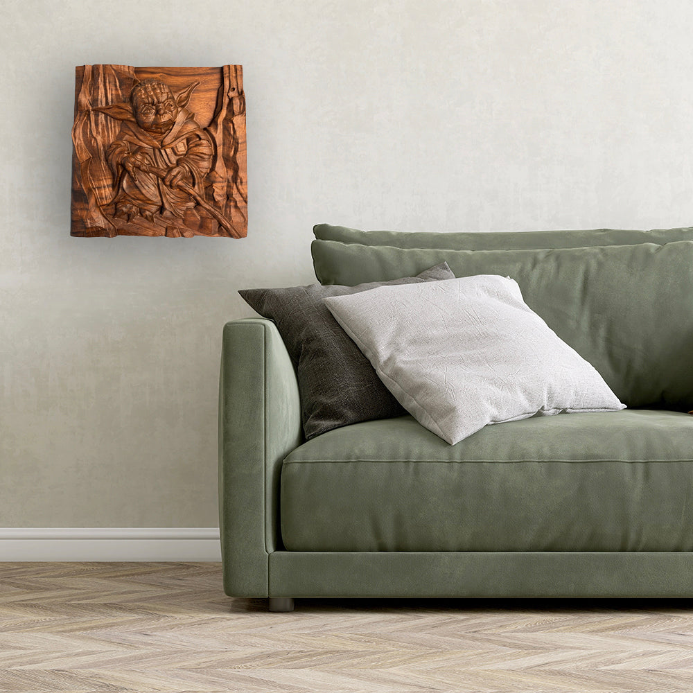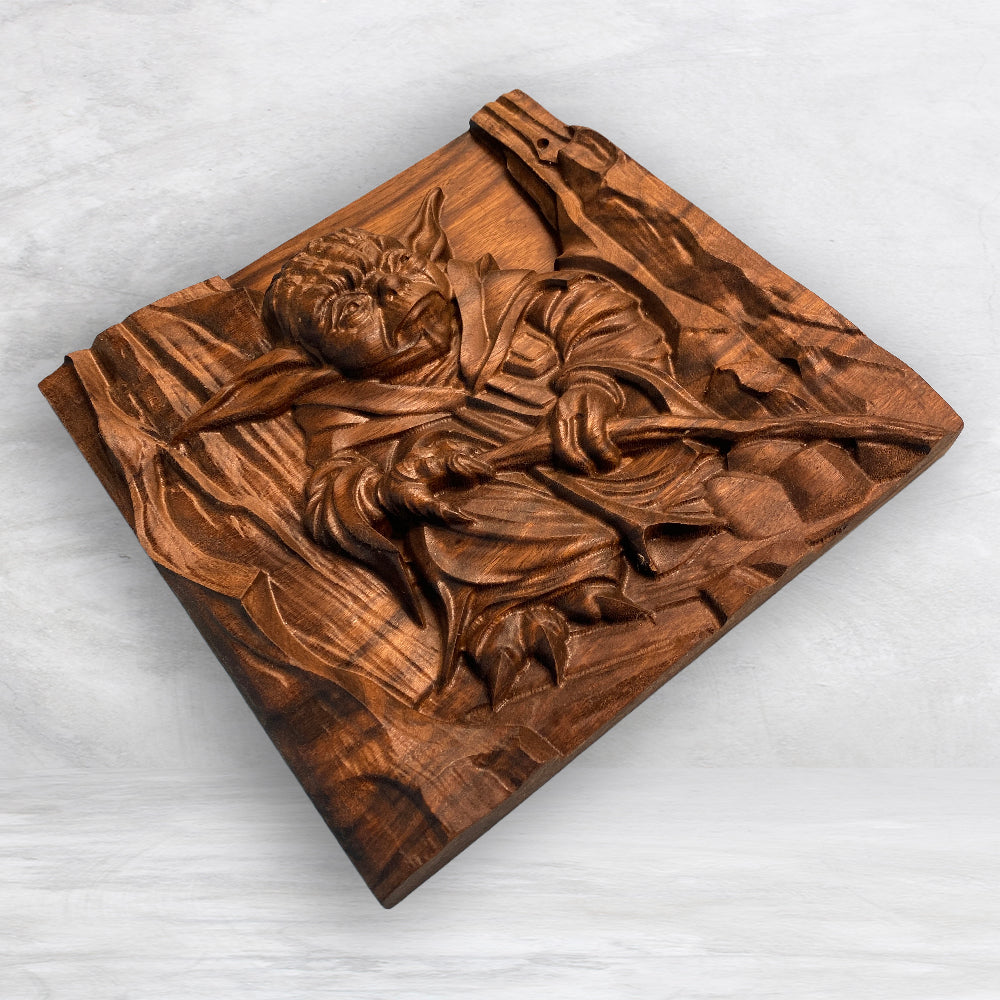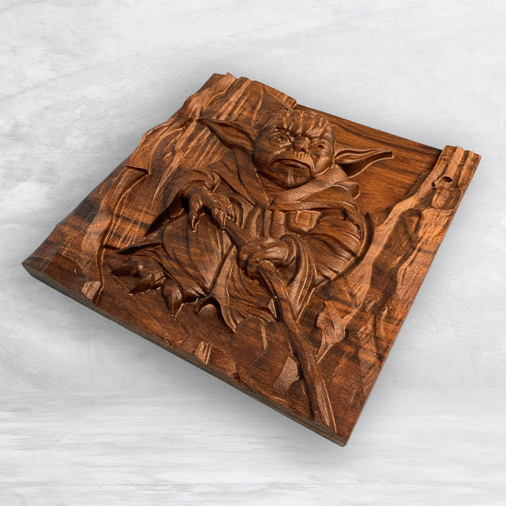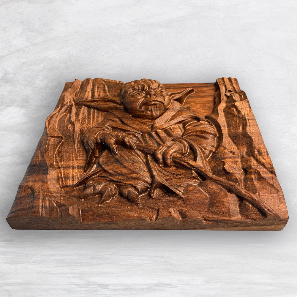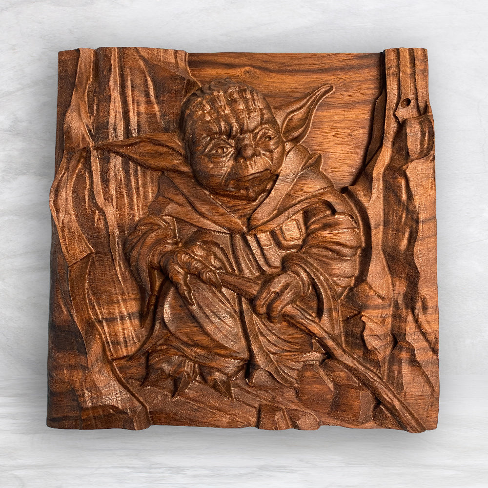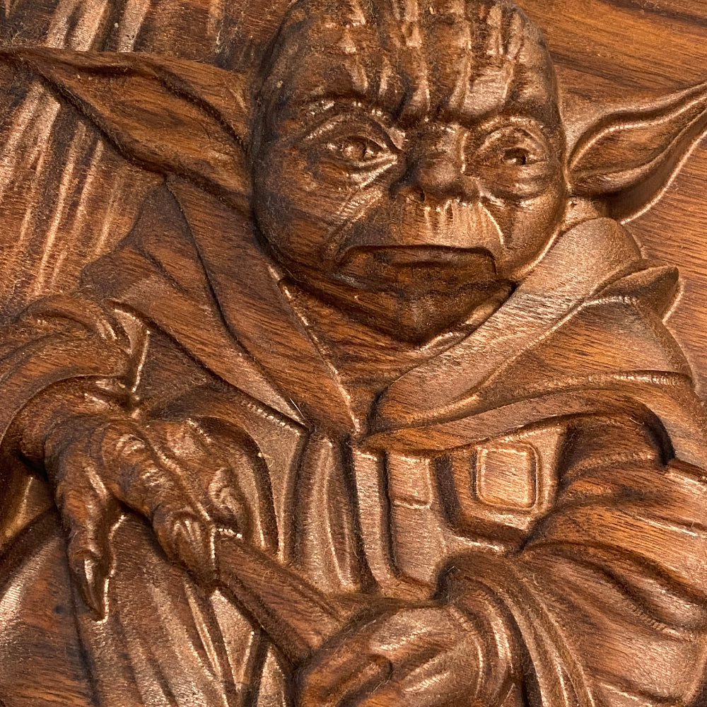 Celebrate the Light with this striking 3D wood carving, entitled "No. There is another..." Precision carved from 2" thick solid premium black walnut, it showcases exceptional detail and craftsmanship. Hand sanded and finished with nourishing Tung oil, this piece offers a smooth, durable surface that highlights the details and the wood’s natural beauty. Made with The Force in the USA, it’s a must-have for true fans seeking a unique addition to their décor.
