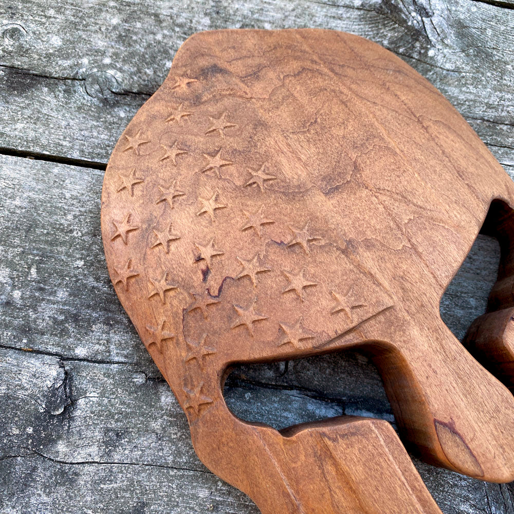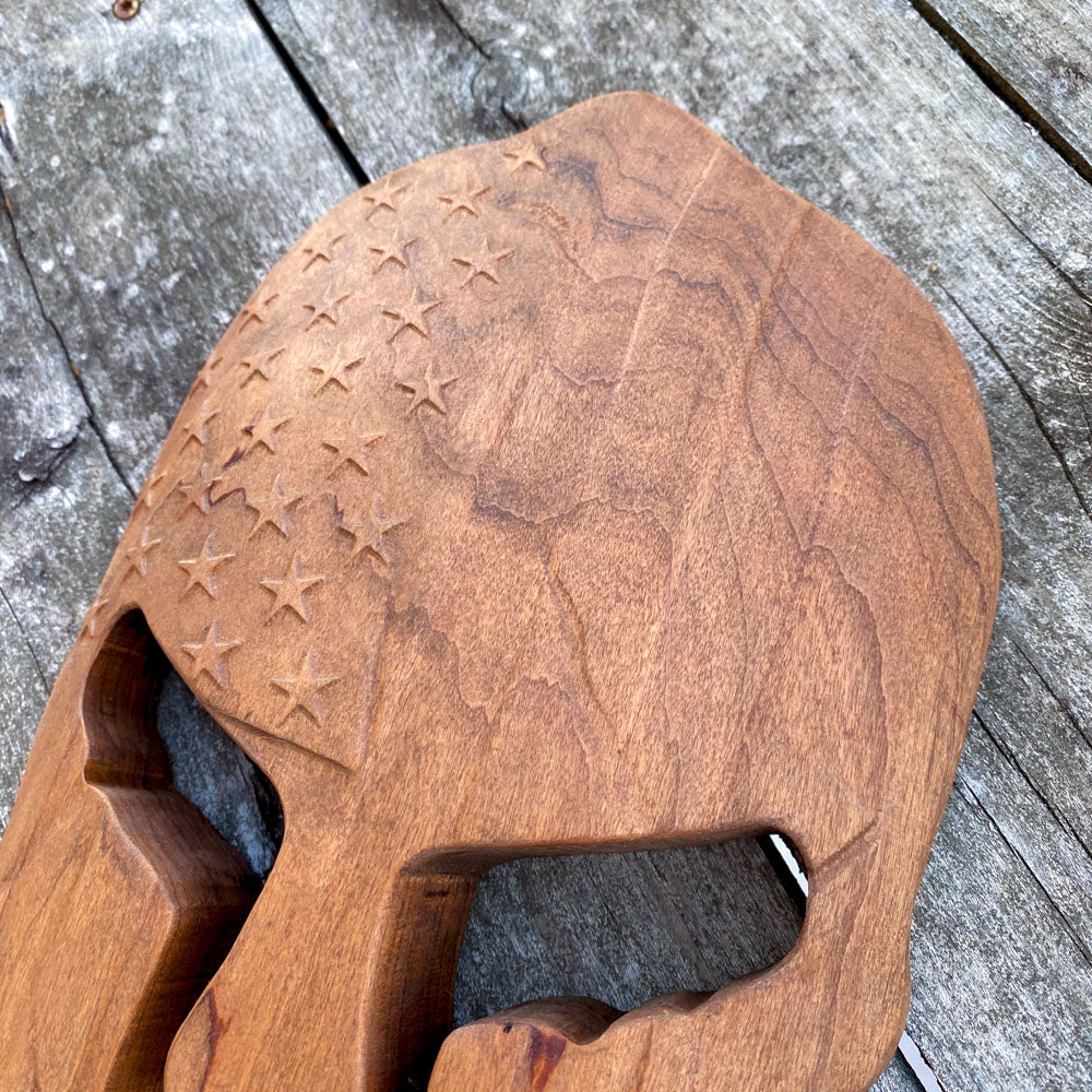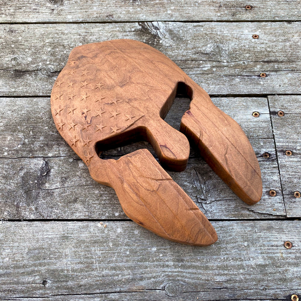 We are not Spartans, WE ARE AMERICANS! This precision carved 3D Spartan helmet is embossed with the Stars & Stripes for a truly unique piece of American Patriot art. This finely crafted item starts as a 2" thick piece of solid Cherry and is then carved into a USA Spartan Helmet, then hand-sanded and finished before getting a hand treatment of natural stain to protect and bring out the natural color and grain of the Cherry hardwood. At more than a foot tall and almost 8" wide, this piece is sure to stand out amongst your American patriot or veteran decor.