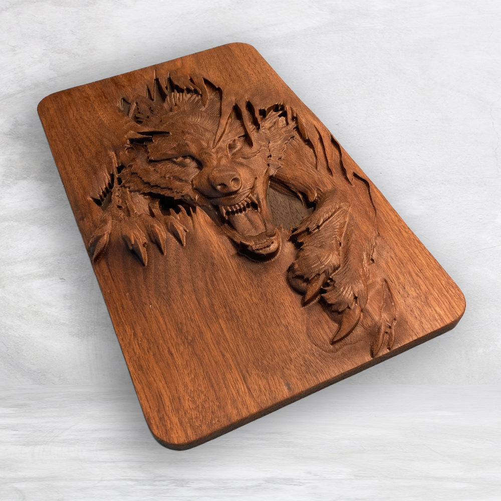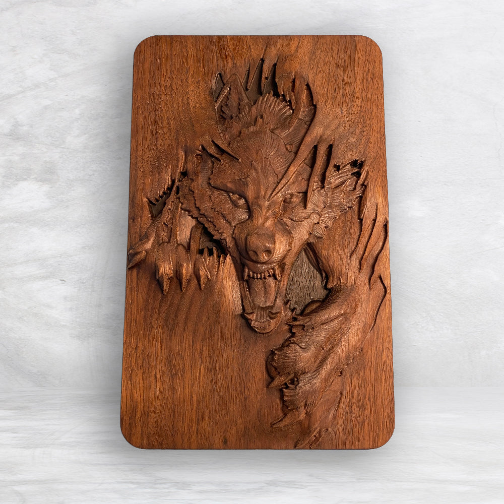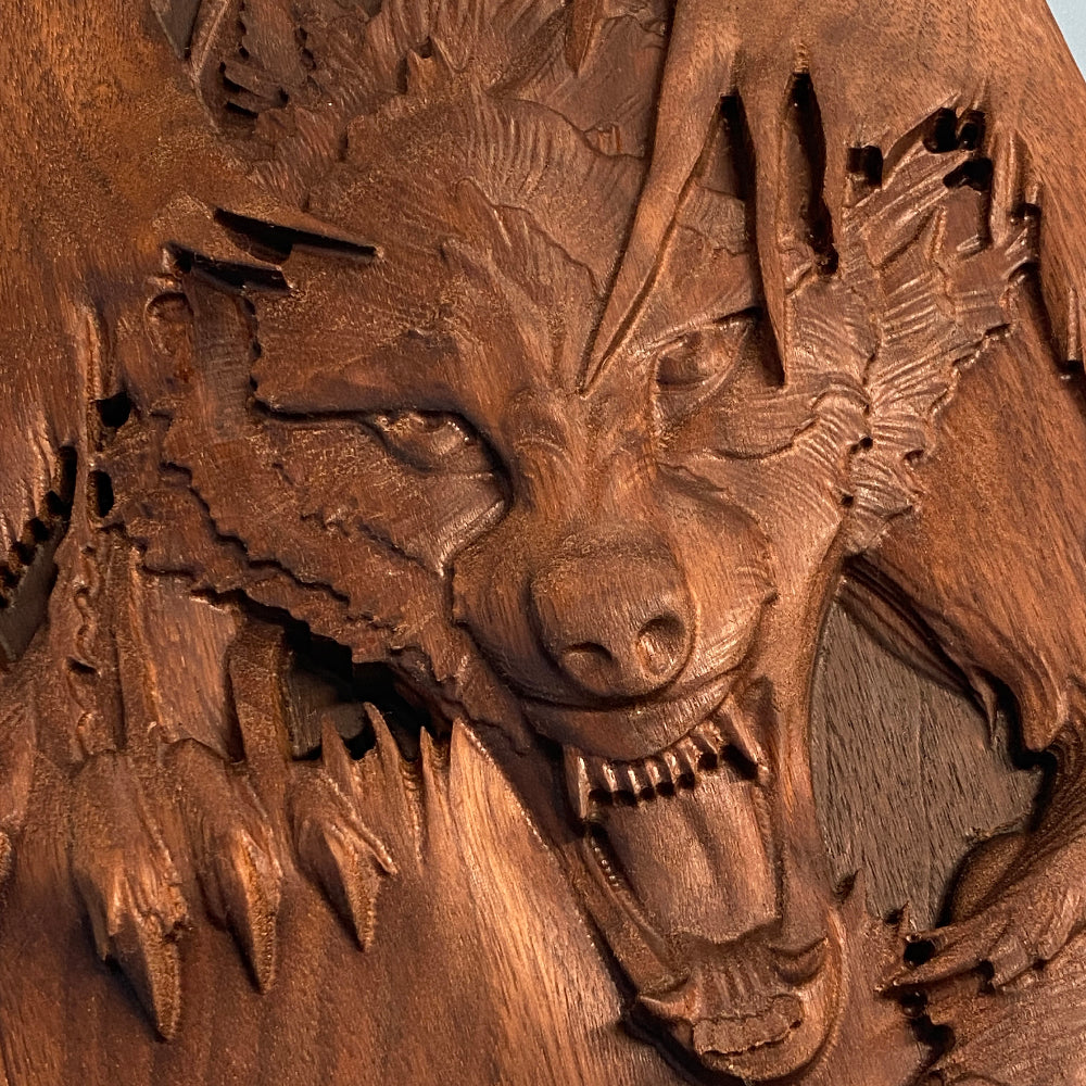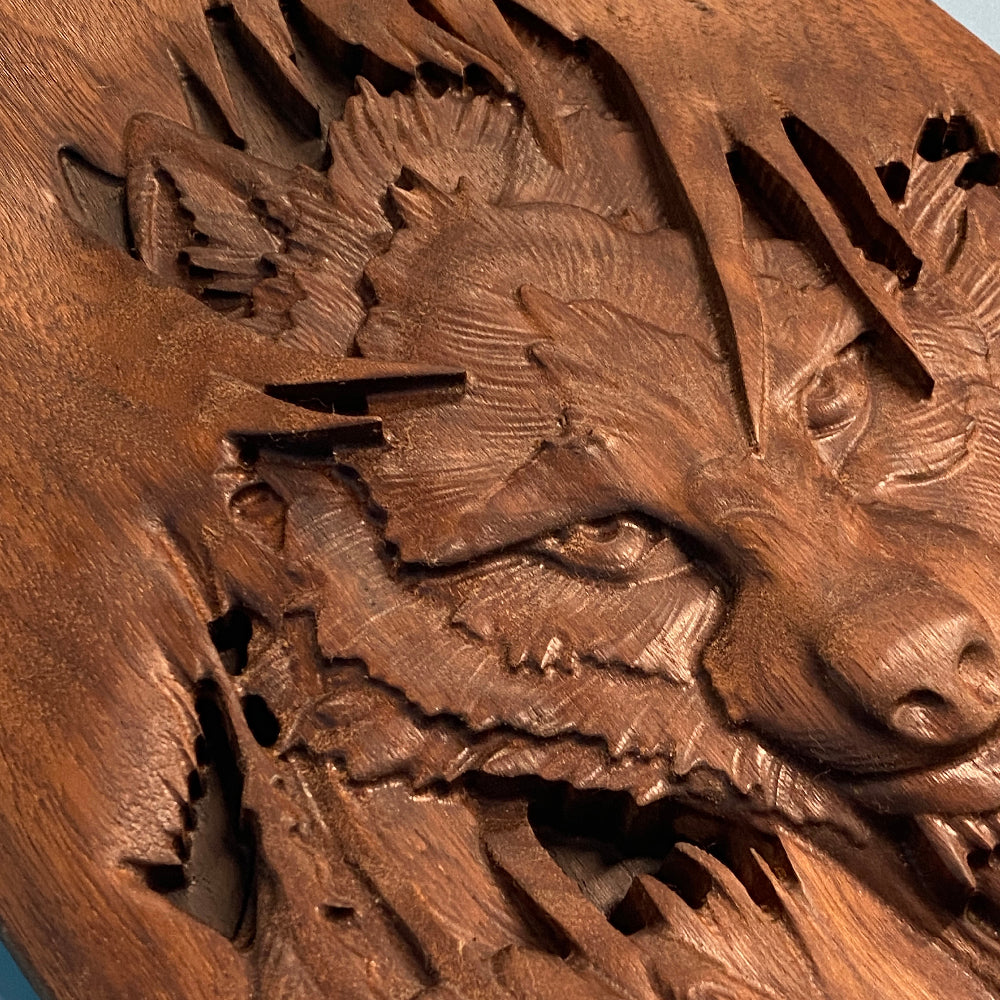 3D Wolf "Mallister Growley" Wood Carving - Precision Carved Solid Premium Walnut Carved Art - Made in USA