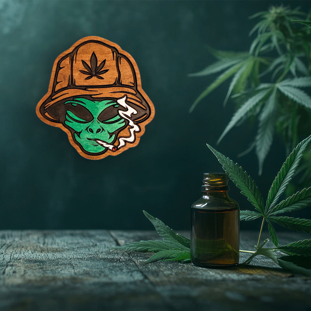 420 Smoking Beach Alien - Precision Carved Solid Cherry Canna 420 Art - Made in USA