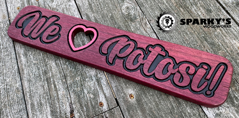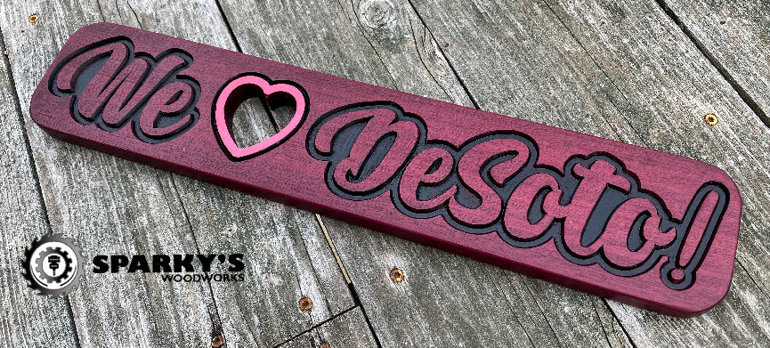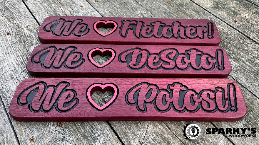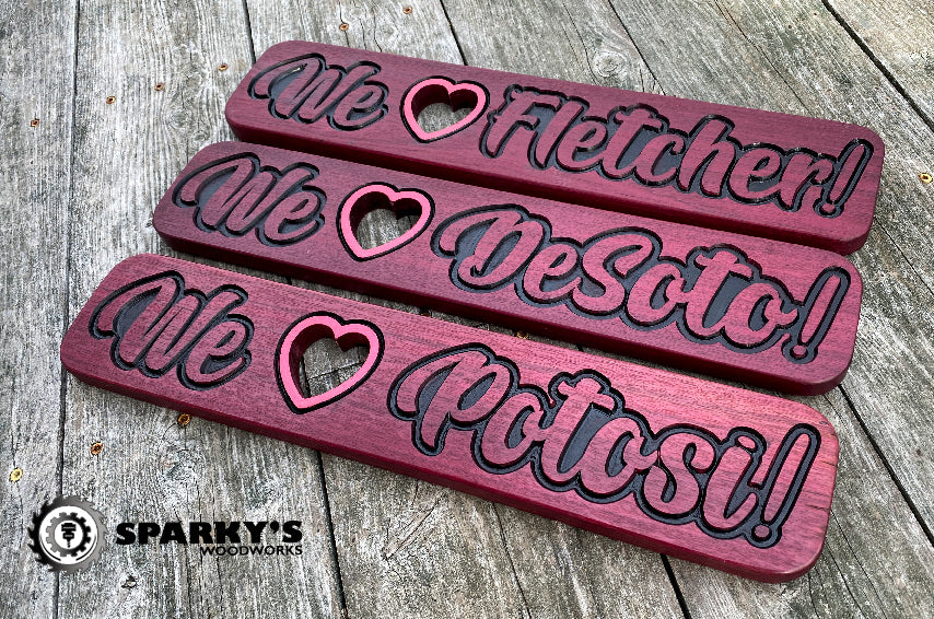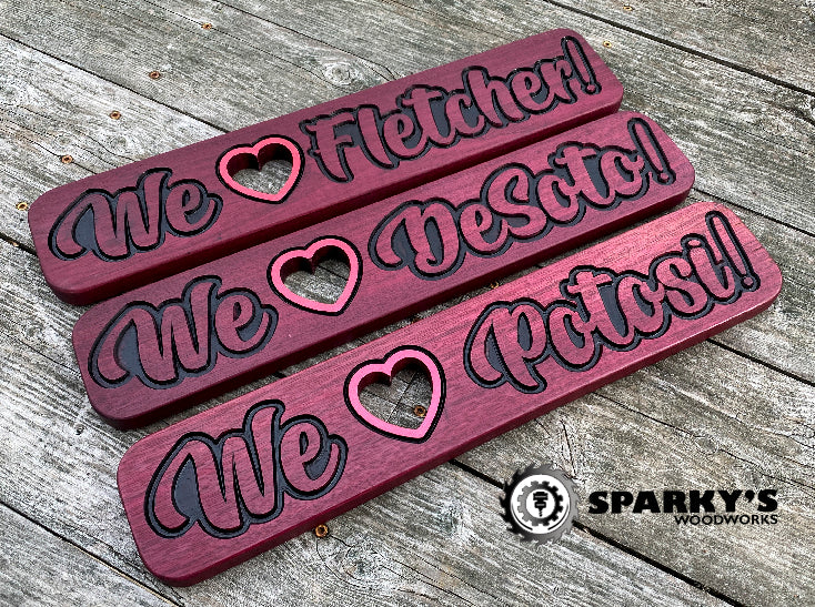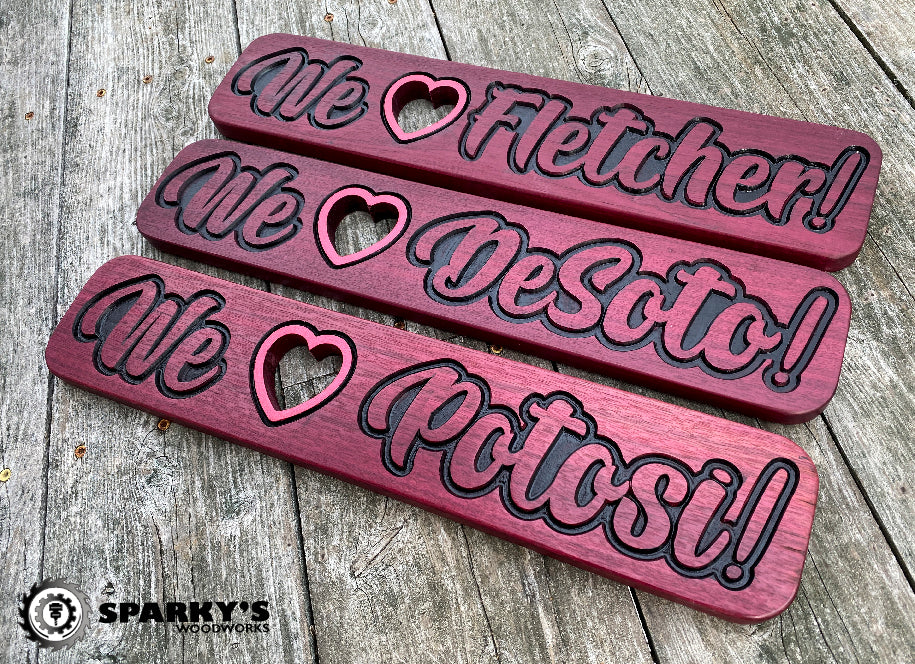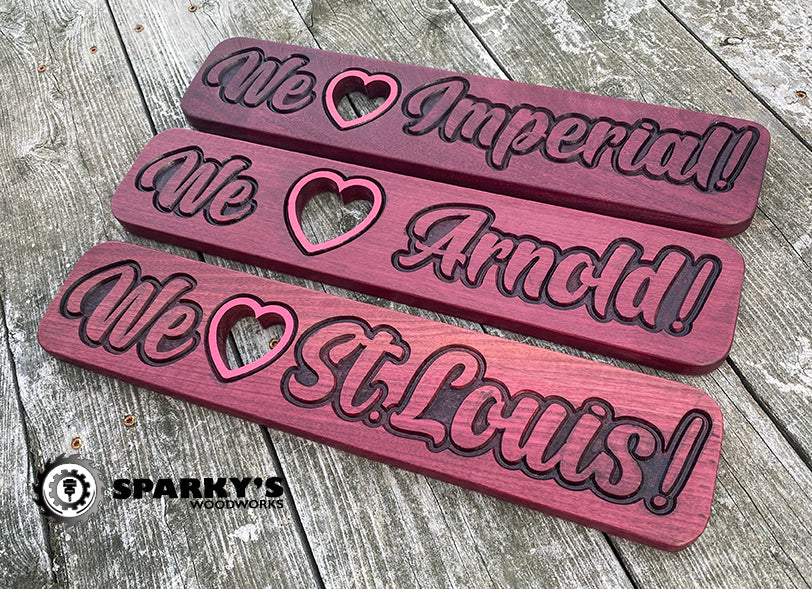 These neighborhood love signs are perfect for your front porch or window, mailbox, sidewalk, or garden. These signs also look great inside on shelves, counters, mantels, and even on the wall. Each sign is carved from a solid piece of Purpleheart, treated with tung oil, and hand painted. Show everyone how much you love your neighborhood with one of our custom Neighborhood Love wood signs!