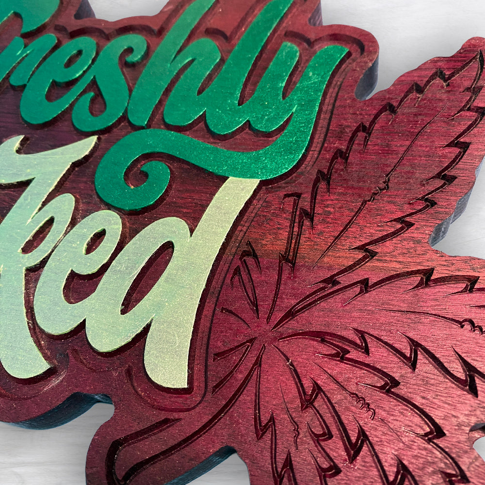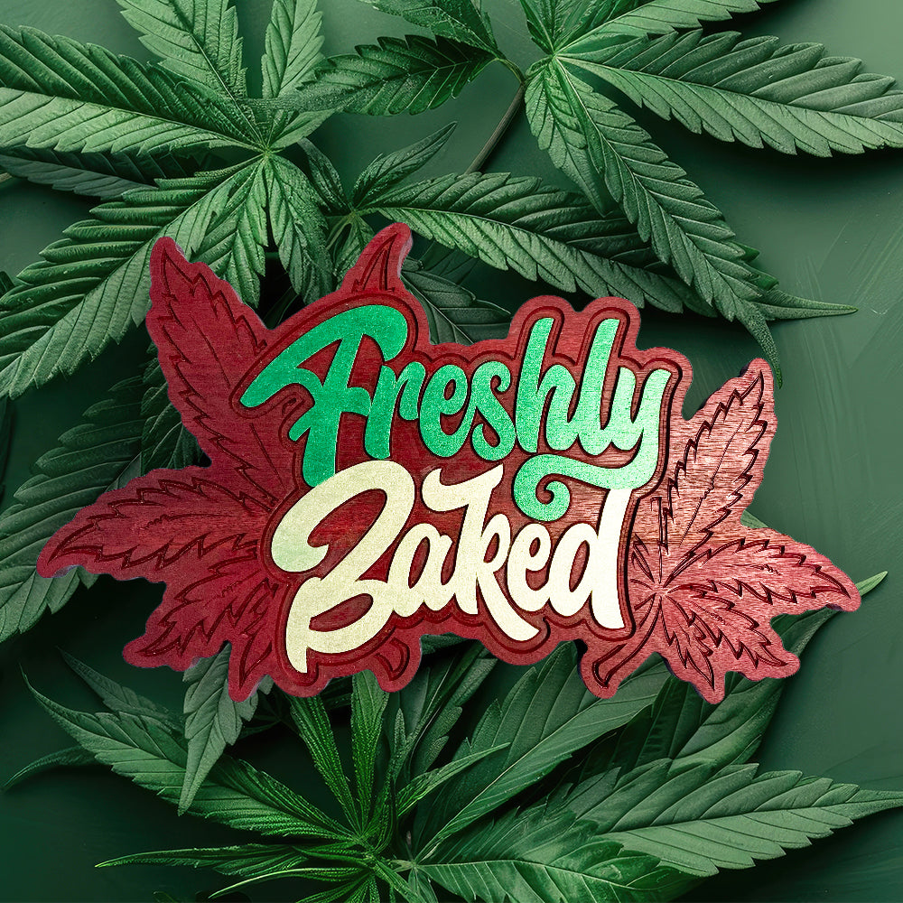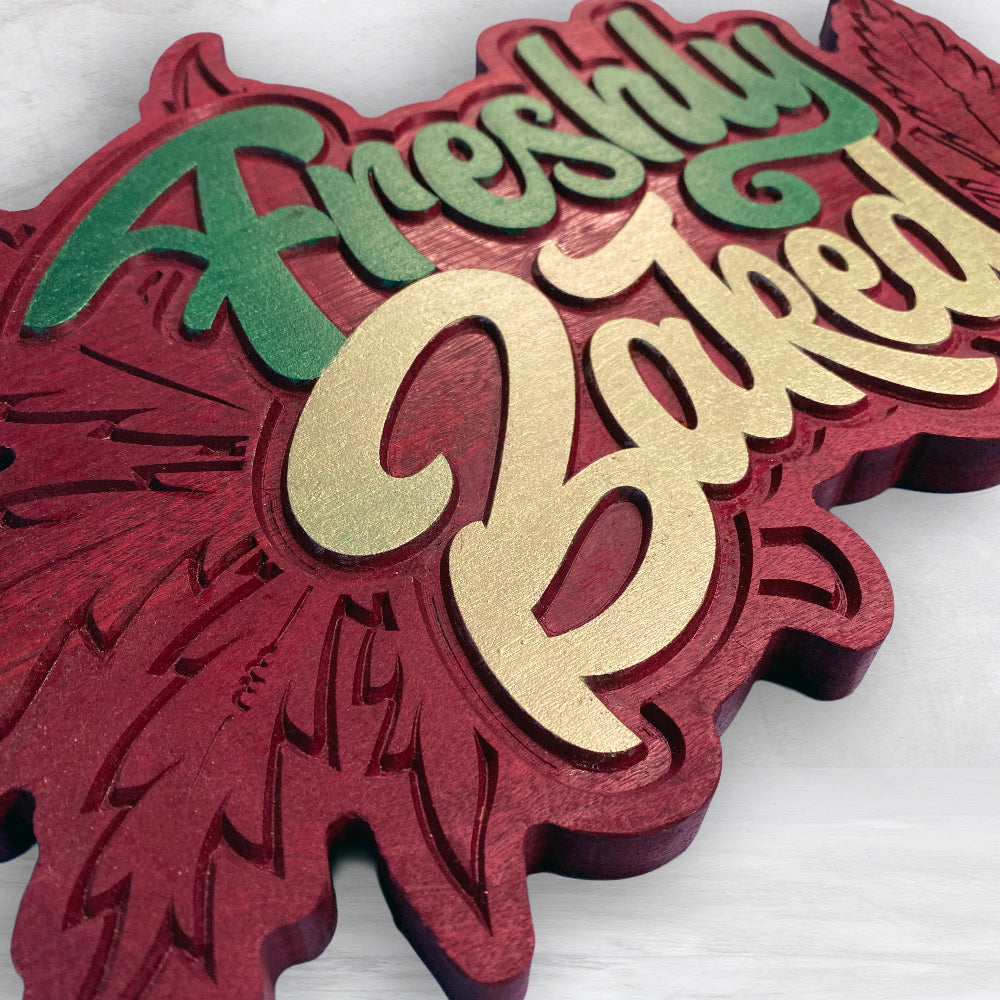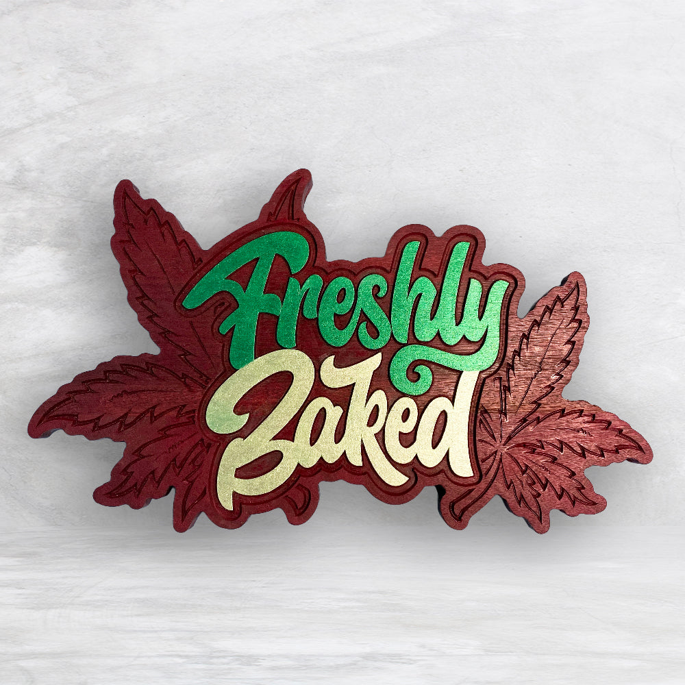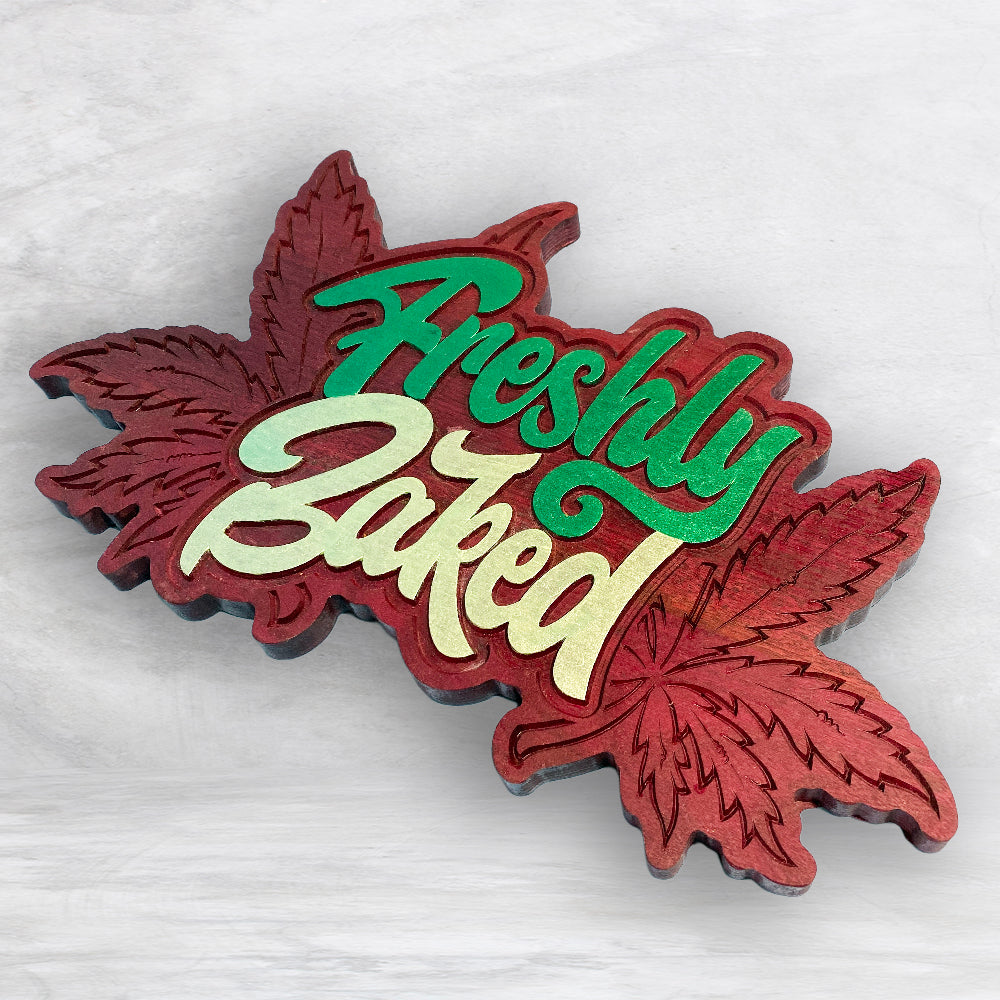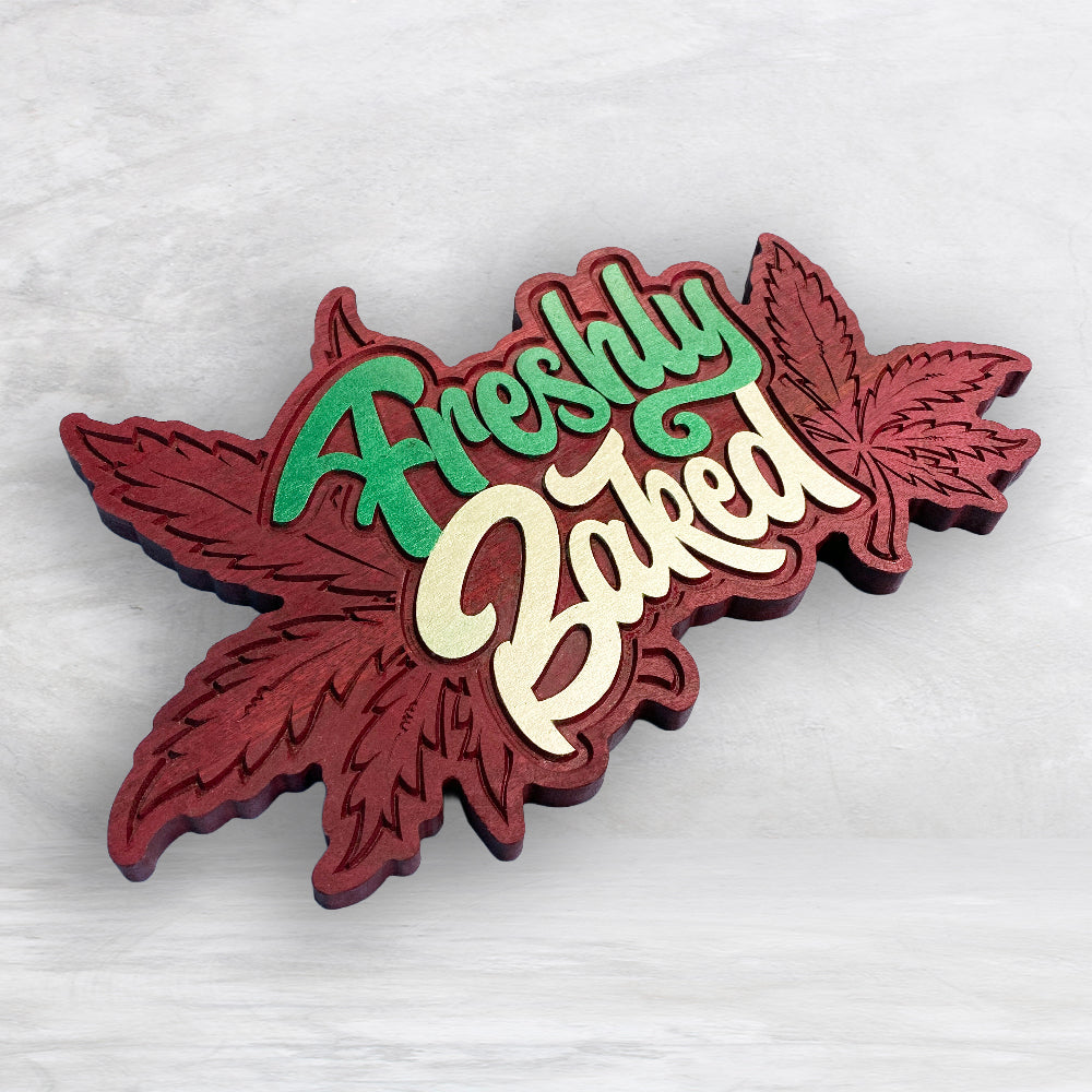 This "Freshly Baked" sign is perfect for the wake-n-bake stoner in your life! Carved from solid purpleheart, hand finished with tung oil, and hand painted with extreme sheen metallic paint, this 420 sign really stands out and makes an impression. Measuring approximately 11.5" x 18.5" this canna sign is large, heavy, and beautiful. Spruce up your canna space with this one-of-a-kind fun sign in solid purpleheart.