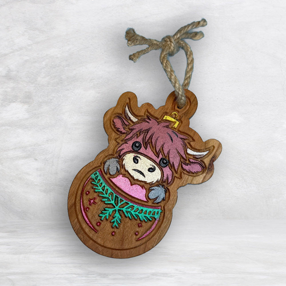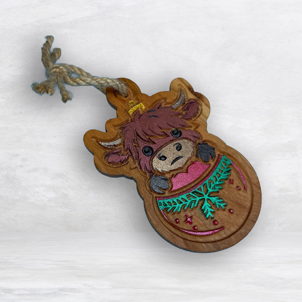 This charming Highland cow ornament brings rustic character to your holiday décor! Standing 4.75" tall and 3" wide, it's crafted from solid 1/4" thick cherry wood and proudly made right here in Missouri. Each piece is hand-sanded, finished, stained, and painted with care, giving your tree a one-of-a-kind artisan touch. Perfect for cow lovers, farm enthusiasts, or anyone who appreciates handcrafted wooden keepsakes that'll have guests asking, "Where'd you get that adorable Highland cutie?"