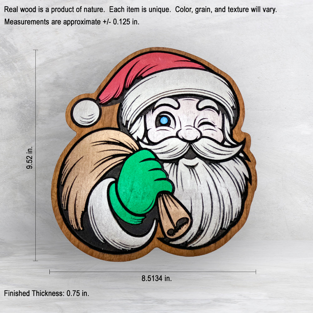 Bring festive cheer to your home with this charming Santa and his sack! Hand-carved from premium solid Cherry wood and finished with meticulous attention to detail, this 9.5" tall holiday treasure features striking True Black and Natural staining paired with shimmering Extreme Sheen Metallic accents. Every piece is individually hand-sanded, stained, and painted by skilled craftspeople right here in the USA. Perfect for mantels, shelves, or as a standout gift for the holidays—a timeless decoration that celebrates the season with warmth and character.