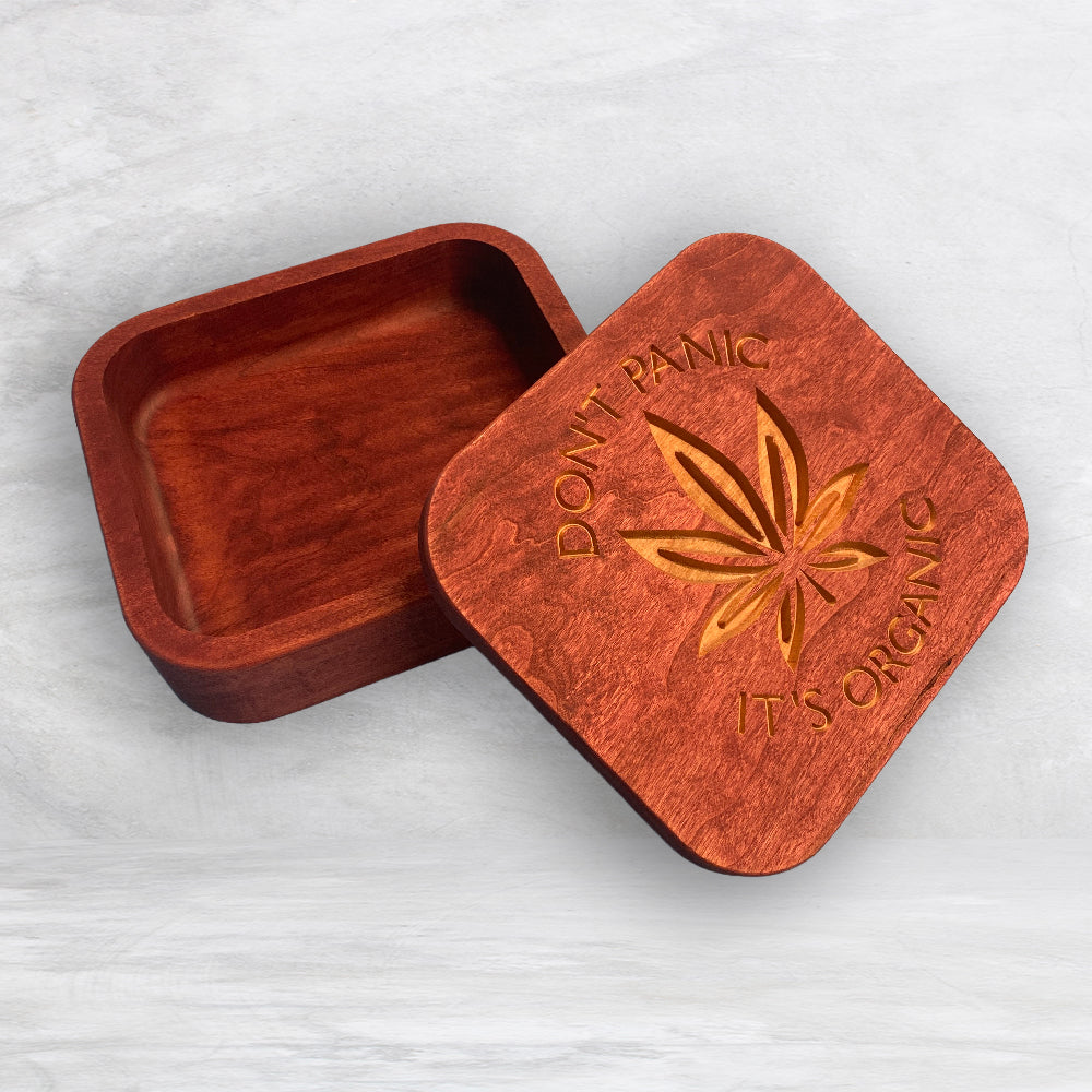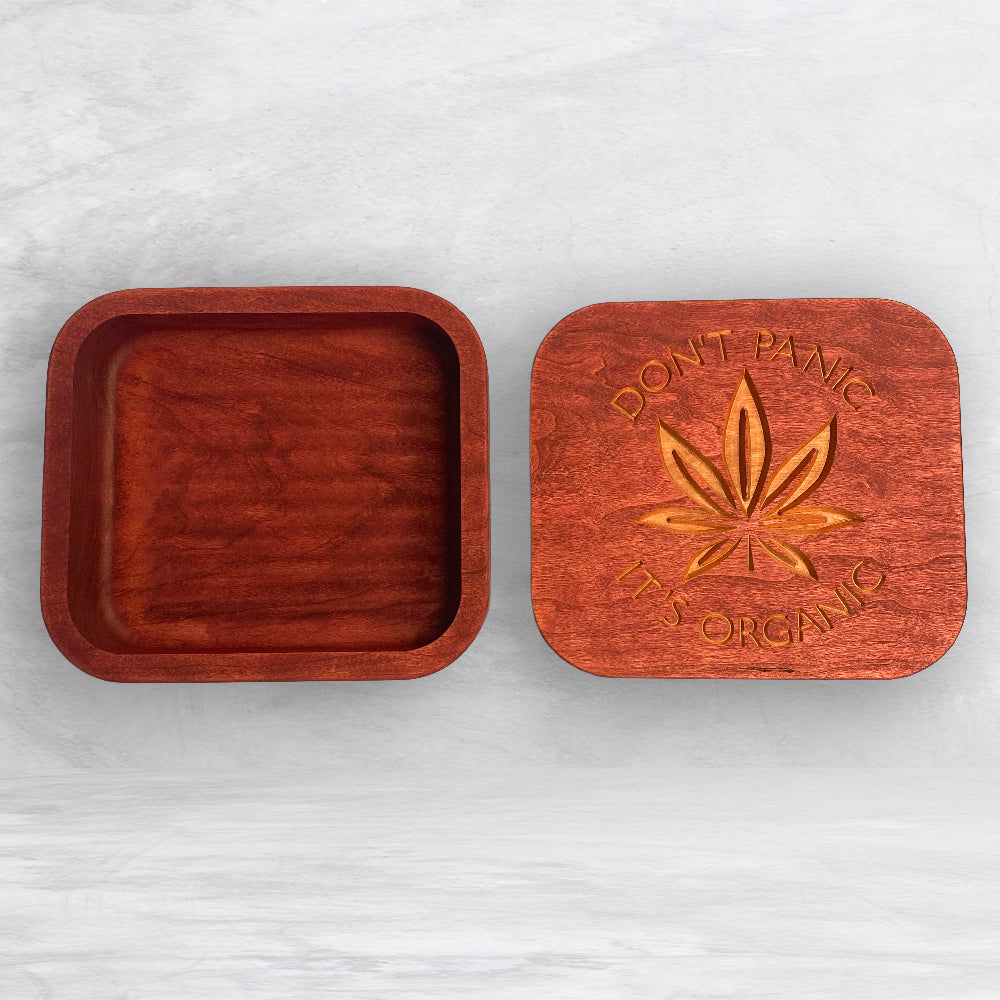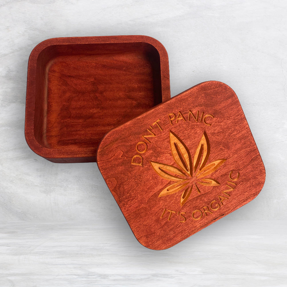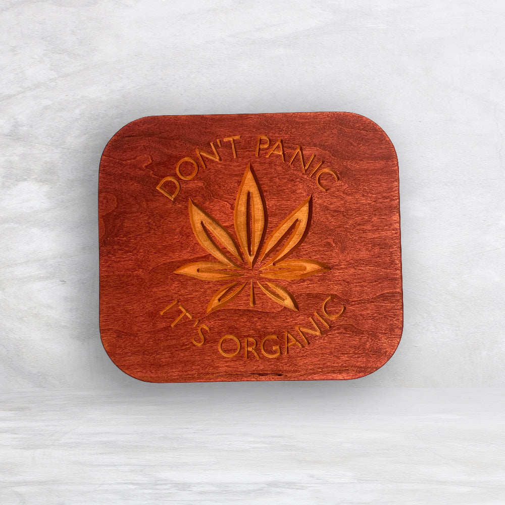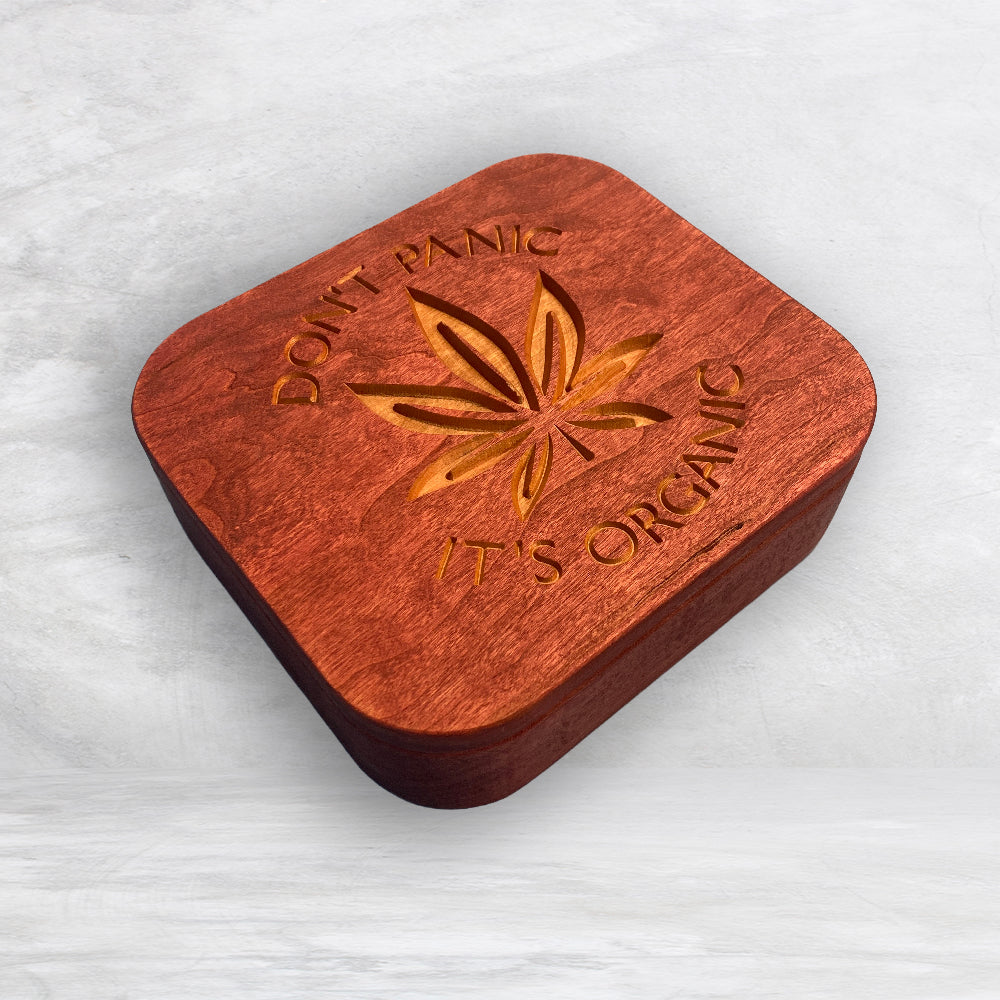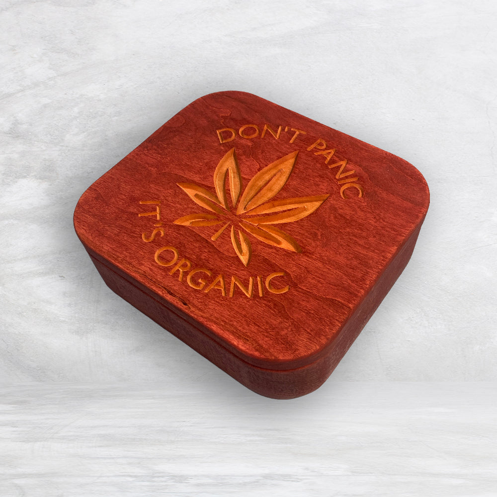 This playful stash box is crafted from 2" thick solid Cherry wood, featuring a hand-carved lid with the cheeky phrase "Don't Panic it's Organic." Hand sanded and finished with a rich Barn Red stain, it offers both charm and quality. Proudly made in the USA, this sturdy box makes a perfect secret keeper with a touch of humor.