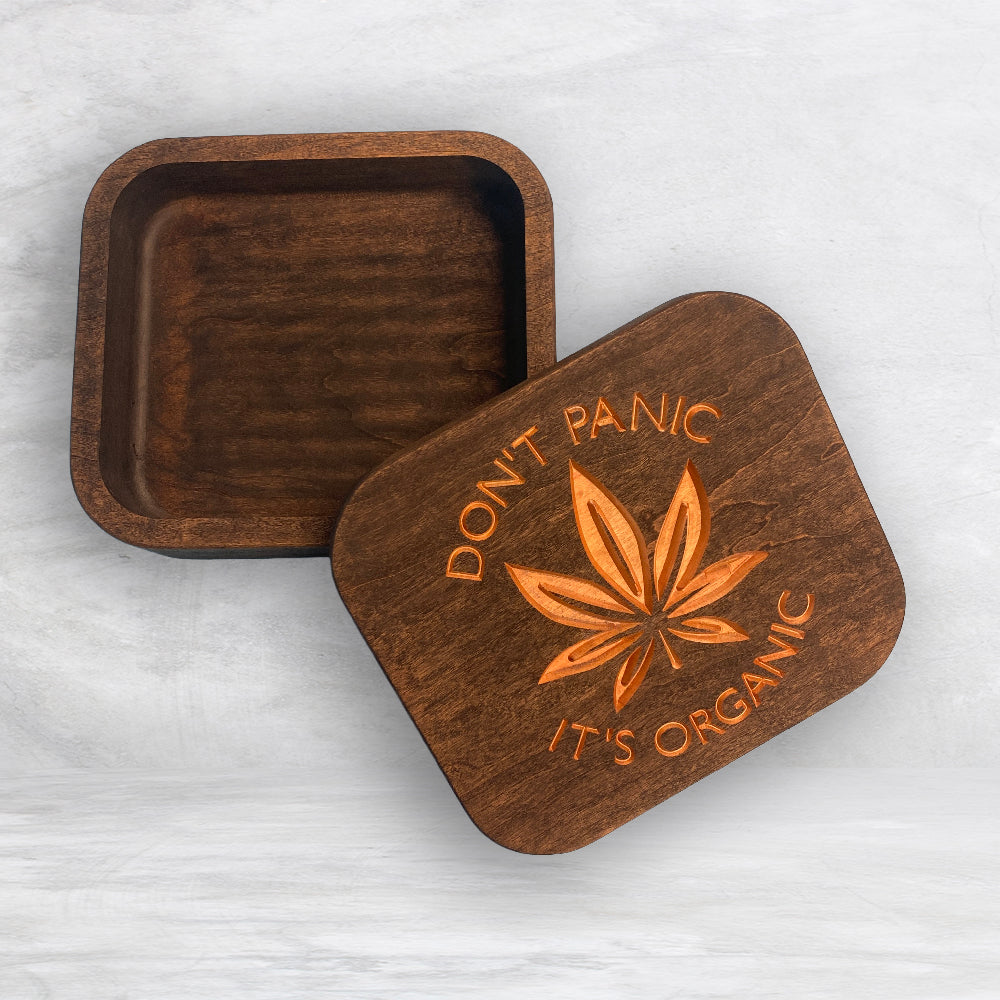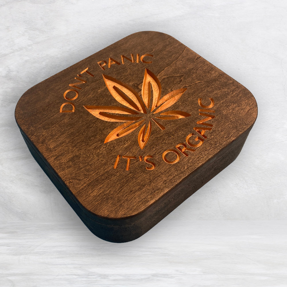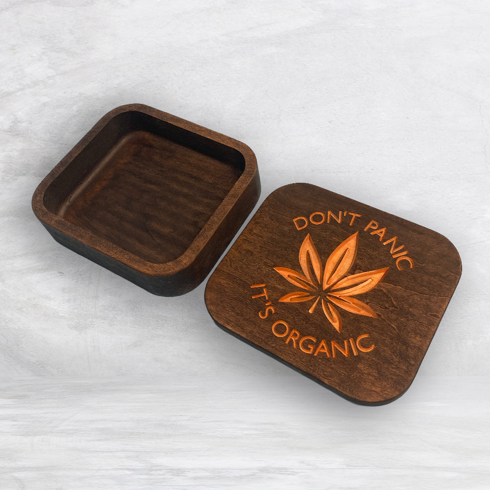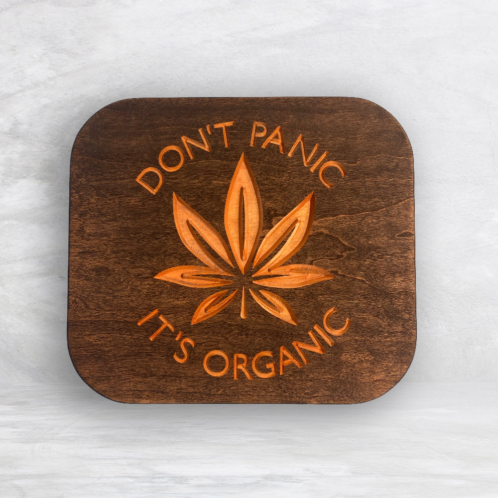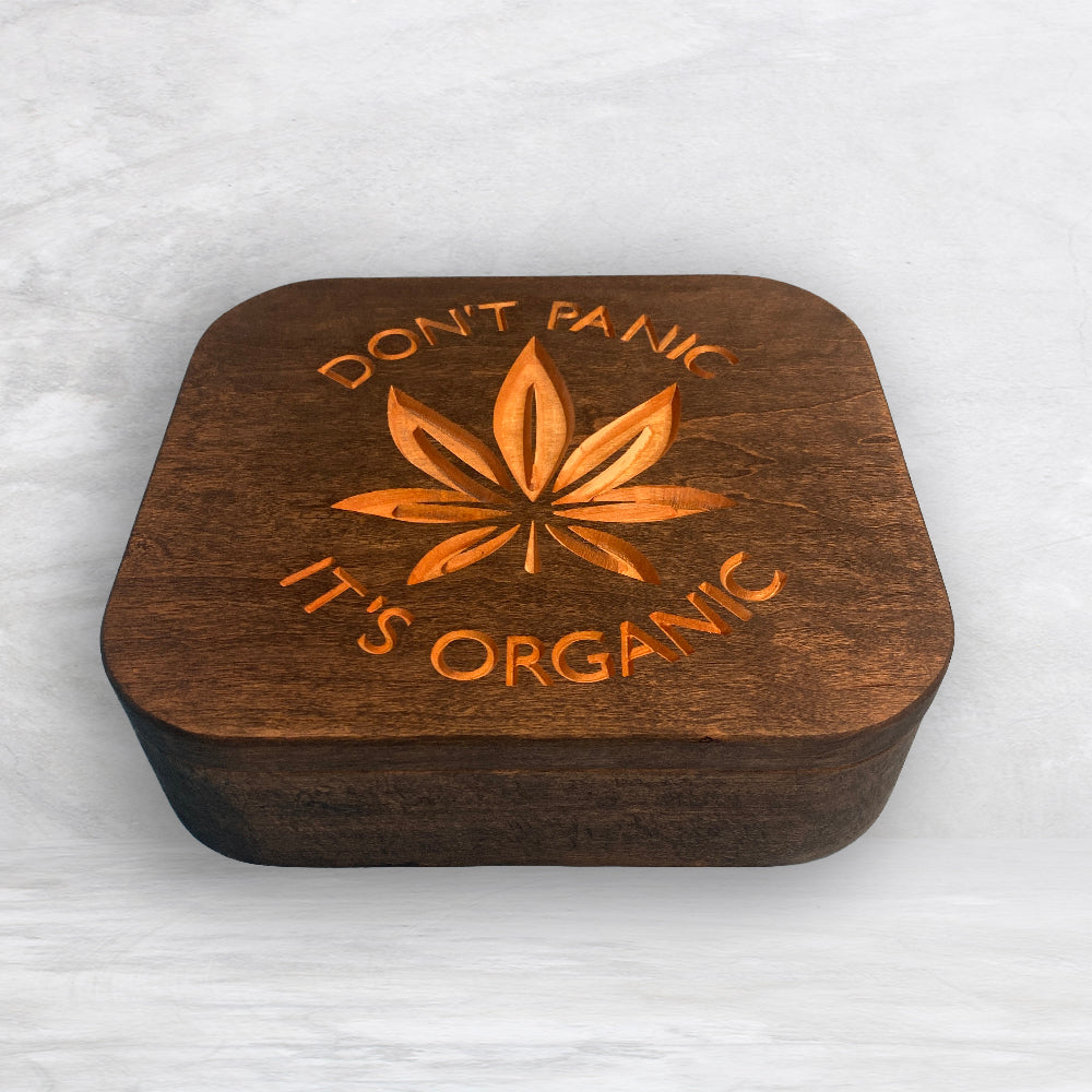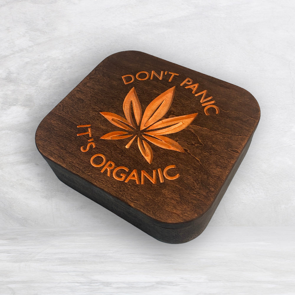 This playful stash box is crafted from 2" thick solid Cherry wood, featuring a hand-carved lid with the cheeky phrase "Don't Panic it's Organic." Hand sanded and finished with a rich dark brown stain, it offers both charm and quality. Proudly made in the USA, this sturdy box makes a perfect secret keeper with a touch of humor.