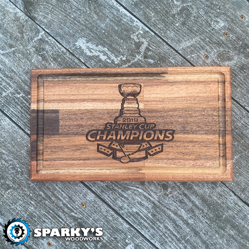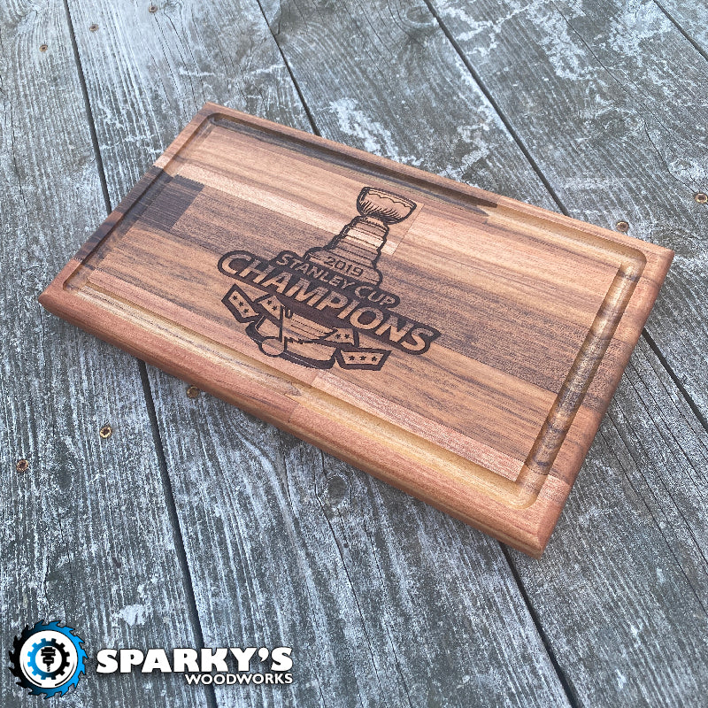 This prototype STL Blues Stanley Cup Cutting Board is perfect for any Blues fan. Handcrafted from 1" thick solid wood, it measures 7.5" x 14". Sanded to smooth perfection, and protected with food-grade butcher block oil, it features a deep juice groove and laser-etched Stanley Cup logo. Only one available! Proudly made in the USA.