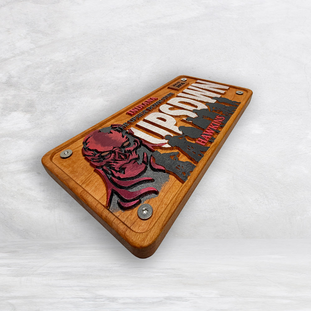 Step into the darkness with this fearless Stranger Things novelty license plate. Carved from solid cherry wood, the UPSDWN design showcases Vecna and the Hawkins crew in striking detail. Hand-sanded, hand-stained with Natural stain, and finished with DecoArt's Extreme Sheen metallic paints, this piece radiates intensity and craftsmanship. Four stainless steel bolts deliver an authentic license plate feel, while keyholes on the back ensure hassle-free mounting. Perfect for collectors who dare to celebrate the supernatural—a handcrafted statement piece that commands attention.